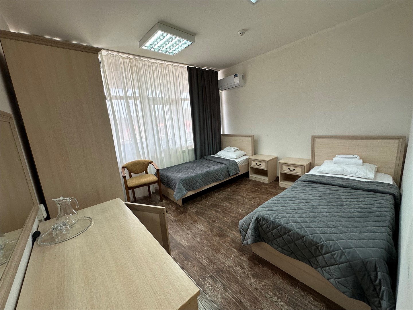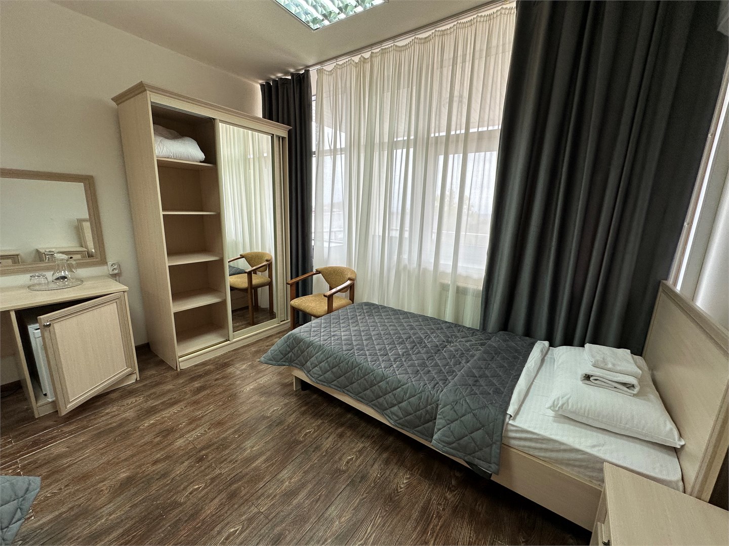 Площадь номера - 32 кв.м. 2 комнаты. 3 осн. места. вид из окон: панорама на Кавказский хребет, внутренняя территория курорта и холмистая лесопарковая местность. В номере: холодильник; телефон; туалет; тапочки; мягкая мебель; туалетные принадлежности; 1-спальные кровати; душевая кабина; ЖК телевизор. 1 доп. место: