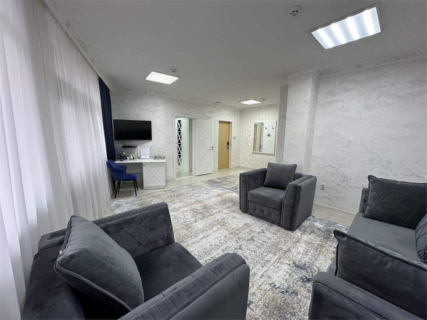 Площадь номера - 38 кв.м. 2 комнаты. 3 осн. места. вид из окон: панорама на Кавказский хребет, внутренняя территория курорта и холмистая лесопарковая местность. В номере: холодильник; телефон; туалет; халаты; тапочки; мягкая мебель; туалетные принадлежности; 2-спальная кровать; душевая кабина; ЖК телевизор. 1 доп. место: